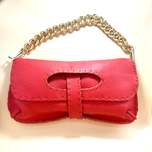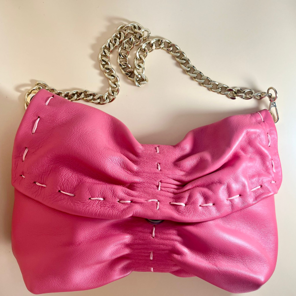 Measurements: 29.5 x 15.5 cm, 4 cm deep. Strap drop: 16.5 cm. Clutch bag in soft bottalato calfskin leather, entirely hand-punched and hand-stitched with waxed cotton thread. Each piece is hand-cut and every raw edge is hand-dyed. The interior lining is in cotton, in the color chosen by the customer. The gold chain is detachable thanks to two small lobster clasps. Magnetic closure. The lining features a small internal pocket. Custom initials can be embroidered upon request.