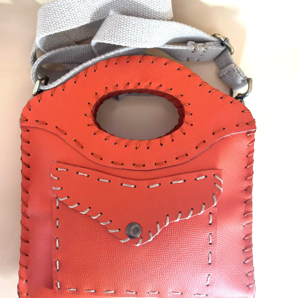 The Trilly shoulder bag, made of printed calfskin. Fabric shoulder strap, removable thanks to lobster clasps. Lined in nappa leather, it features a convenient external pocket with snap closure, measuring 15 x 9 cm. The bag is entirely hand-stitched with waxed thread. The topstitching of the pocket matches the color of the strap ribbon. Upon request, your own initials can be embroidered on the pocket. Please specify this in the notes when ordering. The edges of the item are entirely hand-painted. Measures 22.5 x 24 cm, 3 cm deep.