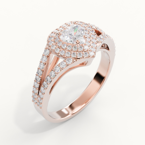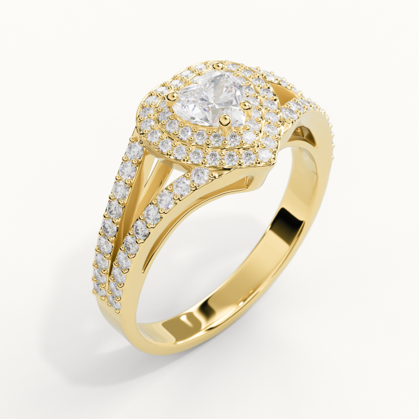 Solitaire ring crafted in 18KT gold, featuring a GIA-certified central Heart-cut Natural Diamond of 0.30 CT, Color F, Clarity VS1, surrounded by natural diamonds of Color DEF and Clarity VS, totaling 0.75 CT. Total carat weight of Natural Diamonds: 1.05 CT. Ring weight: approximately 5GR (varies by size).
