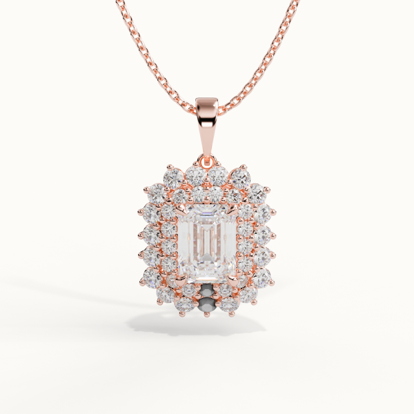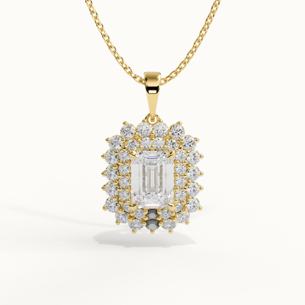 Pendant crafted in 18KT gold, set with a GIA-certified central Natural Emerald-Cut Diamond of 0.70CT, Color F, Clarity VS1. Surrounded by 1.30CT of Natural Diamonds, Color DEF, Clarity VS. Total Natural Diamond Carat Weight: 2.00CT Total weight: approximately 4.00GR ( 45cm 18KT gold chain included ).