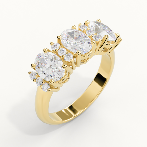 Trilogy ring crafted in 18KT gold, featuring 3 central Oval-cut Natural Diamonds of 0.25CT each, Color DEF, Clarity VS. Surrounded by 0.12CT of Natural Diamonds, Color DEF, Clarity VS. Total carat weight of Natural Diamonds: 0.87CT. Ring weight: approximately 3GR (varies by size).