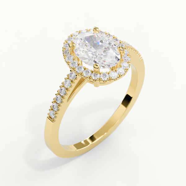 Solitaire ring crafted in 18KT gold, featuring a GIA-certified central Oval-cut Natural Diamond of 0.50 CT, Color F, Clarity VS1, surrounded by natural diamonds of Color DEF and Clarity VS, totaling 0.35 CT. Total carat weight of Natural Diamonds: 0.85 CT. Ring weight: approximately 3.5GR (varies by size).
