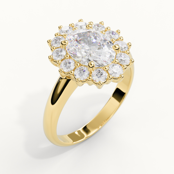 Solitaire ring crafted in 18KT gold, featuring a certified GIA 0.50 CT natural Oval Cut diamond, color F, clarity VS1, surrounded by natural diamonds of color DEF and clarity VS, totalling 0.25 CT. Total carat weight of natural diamonds: 0.75 CT. Ring weight approximately 4GR (Depends on the Size).