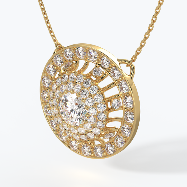 "Punto Luce" pendant crafted in 18kt gold (750/1000) with a GIA-certified 1.00CT center diamond, color D, clarity VVS1, surrounded by natural diamonds of color DEF and clarity VVS totaling 10.00CT. Total gold weight 15GR with a 45CM chain (may vary depending on chain length). Personalized home delivery.
