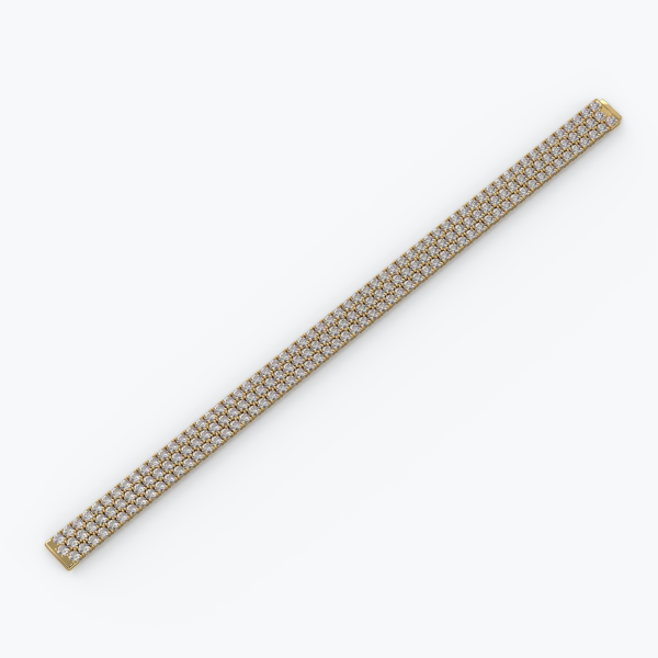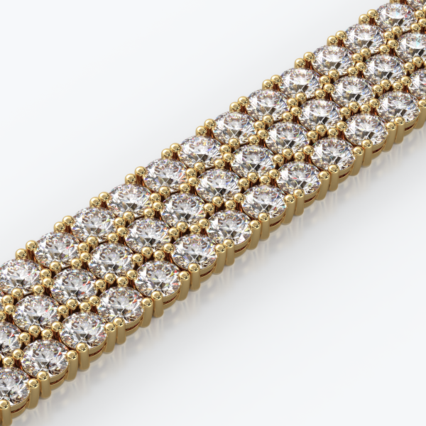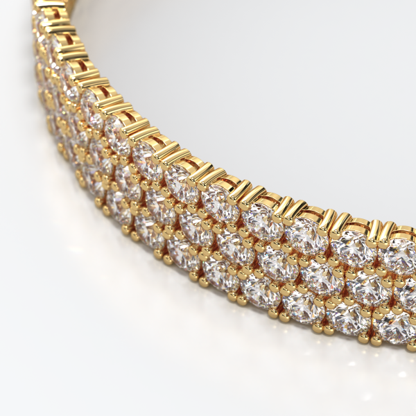 Classic Tennis bracelet with round prongs in 18KT (750/1000) gold, embellished with Natural Diamonds of Color DEF and Clarity VVS. Total carat weight and gold weight vary by length; 16CM: 30GR / 13.50CT APPROX. 17CM: 32GR / 14.40CT APPROX. 18CM: 34GR / 15.30CT APPROX. 19CM: 36GR / 16.20CT APPROX. 20CM: 38GR / 17.10CT APPROX. 21CM: 40GR / 18.00CT APPROX.