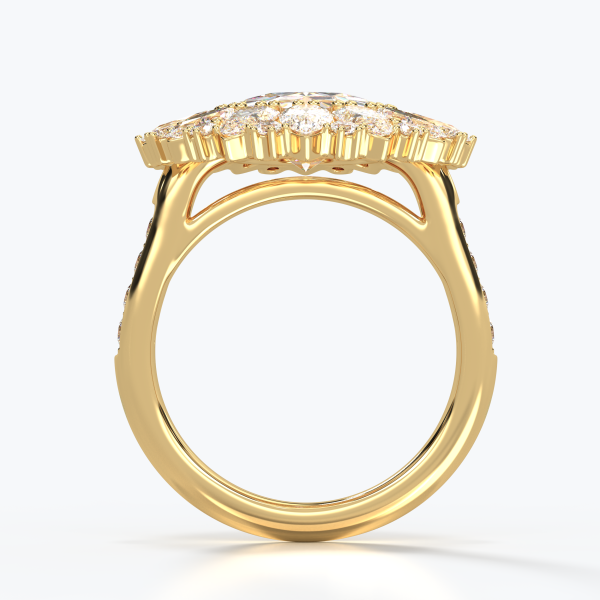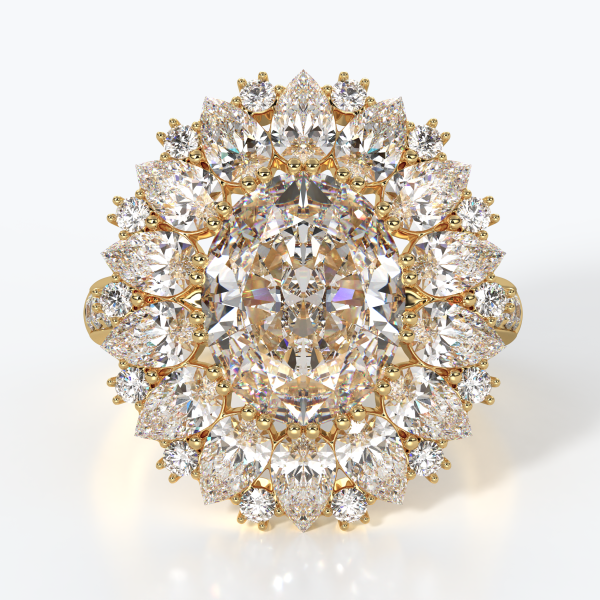 IMPERIALE ring crafted in 18KT (750/1000) gold, featuring a GIA-certified central Natural Diamond of 2.00 CT, Color D, Clarity VVS1; Surrounded by Pear-cut and Round-cut natural diamonds of Color DEF and Clarity VVS, totaling 4.00 CT. Total carat weight of Natural Diamonds: 6.00 CT; Total weight: approximately 20GR (varies by size).