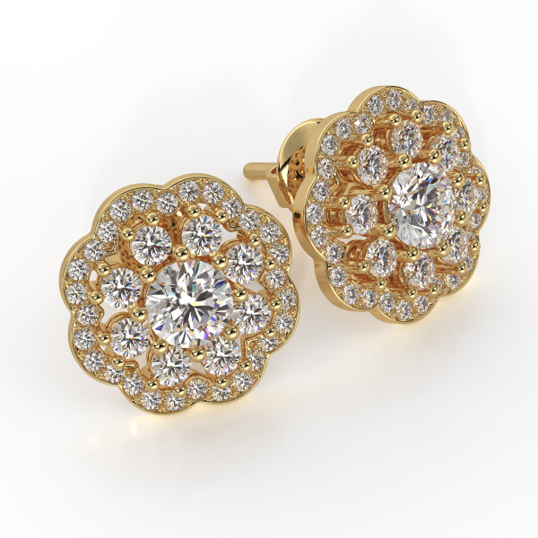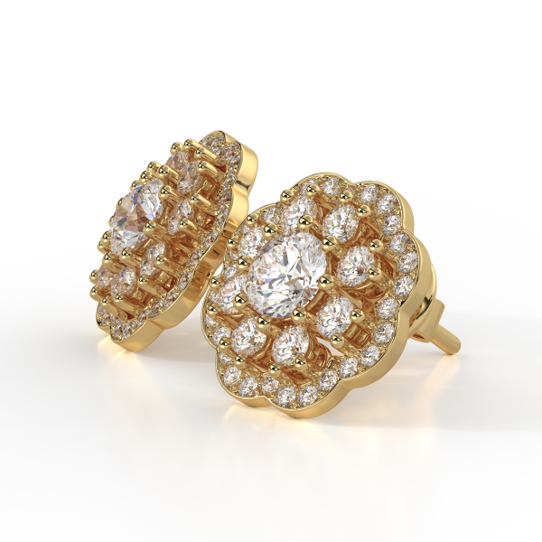 18kt yellow gold (750/1000) earrings, featuring certified GIA Natural Central Diamonds (0.30CT each) of Color D, Clarity VVS1, totaling 0.60CT. Surrounded by Natural Diamonds of Color DEF, Clarity VVS, totaling 0.50CT. Total weight approximately 8GR. Personalized home delivery.