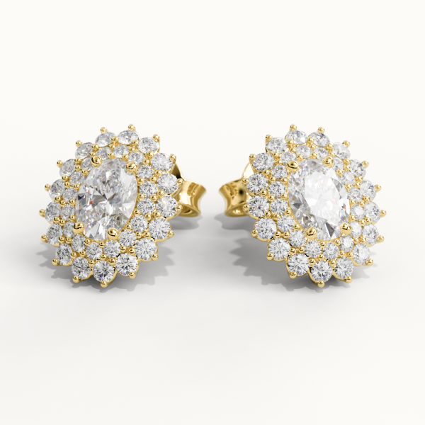 18kt yellow gold (750/1000) earrings, featuring certified GIA Natural Central Diamonds (0.30CT each) of Color D, Clarity VVS1, totaling 0.60CT. Surrounded by Natural Diamonds of Color DEF, Clarity VVS, totaling 0.50CT. Total weight approximately 8GR. Personalized home delivery.