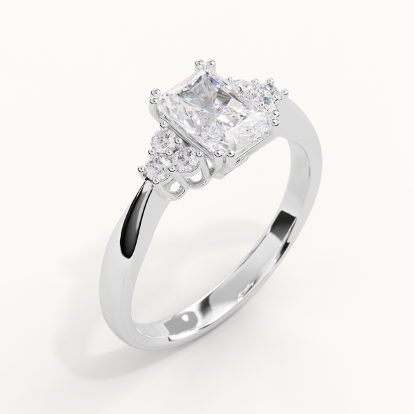 Solitaire ring crafted in 18KT gold, featuring a GIA-certified central Emerald-cut Natural Diamond of 0.50 CT, Color F, Clarity VS1, surrounded by natural diamonds of Color DEF and Clarity VS, totaling 0.12 CT. Total carat weight of Natural Diamonds: 0.62 CT. Ring weight: approximately 3GR (varies by size).