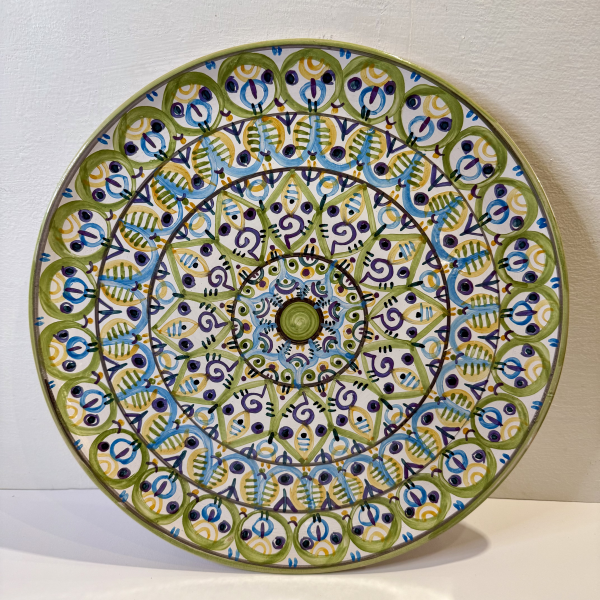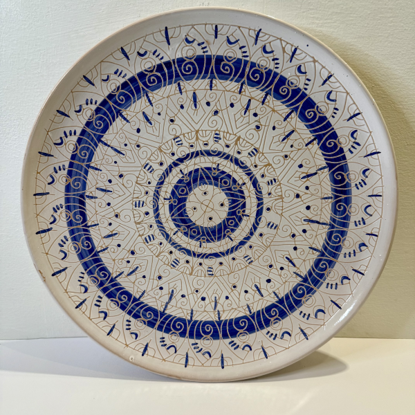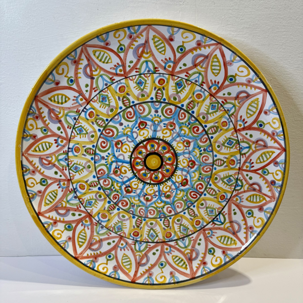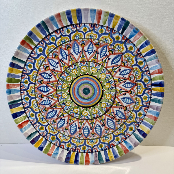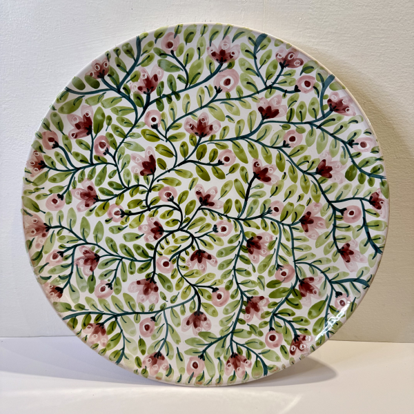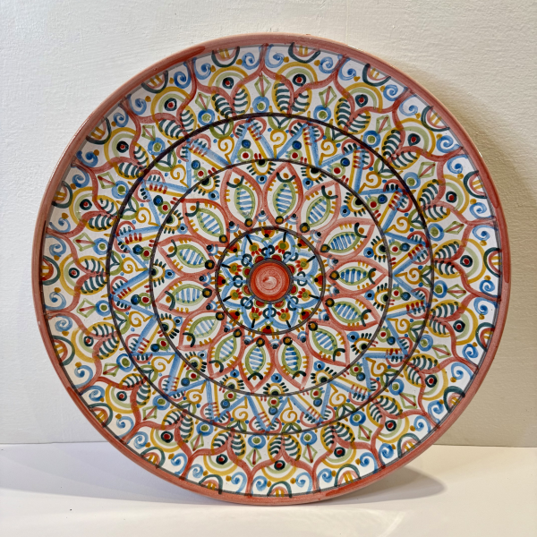 Handcrafted 38 cm diameter smooth plate with freehand painted decorations. One-of-a-kind piece.