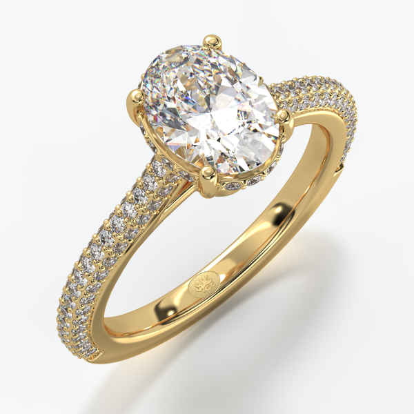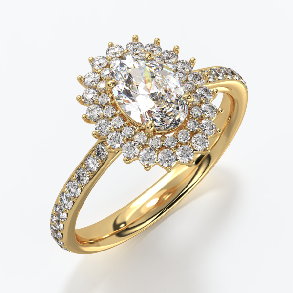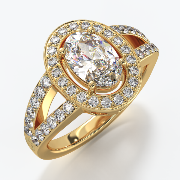Solitare ring crafted in 18KT gold with a GIA-certified Oval-cut natural center diamond of 1.00 CT, color D, clarity VVS1, surrounded by natural diamonds of color DEF and clarity VVS with a total weight of 1.20 CT. Ring weight approximately 7GR (depends on size).