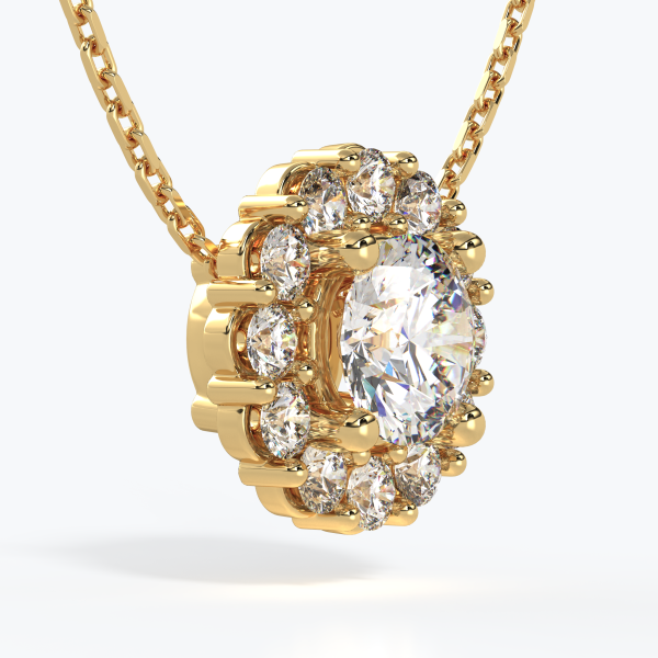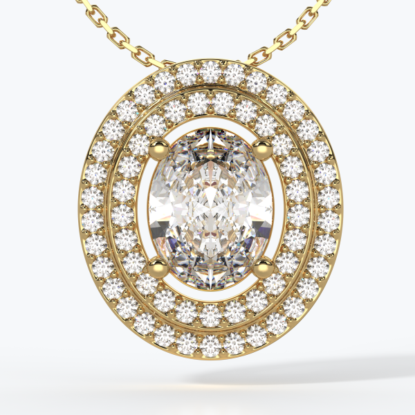 "Punto Luce" pendant crafted in 18kt gold (750/1000) with a GIA-certified Oval-cut Diamond of 1.00CT, color D, clarity VVS1, surrounded by Natural Diamonds of color DEF and clarity VVS, totaling 1.20CT. Total gold weight 12GR with a 45CM chain (may vary depending on chain length).