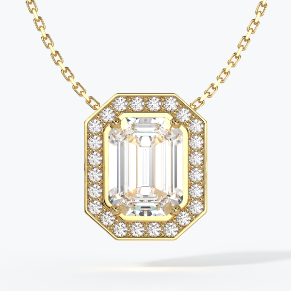 Pendant crafted in 18kt (750/1000) gold, featuring a GIA-certified Emerald-cut Diamond of 1.00CT, Color D, Clarity VVS1. Surrounded by Natural Diamonds of Color DEF, Clarity VVS, totaling 1.20CT. Total diamond carat weight: 2.20CT Total gold weight: 12GR with 45CM chain (varies depending on chain length). Customized home delivery.