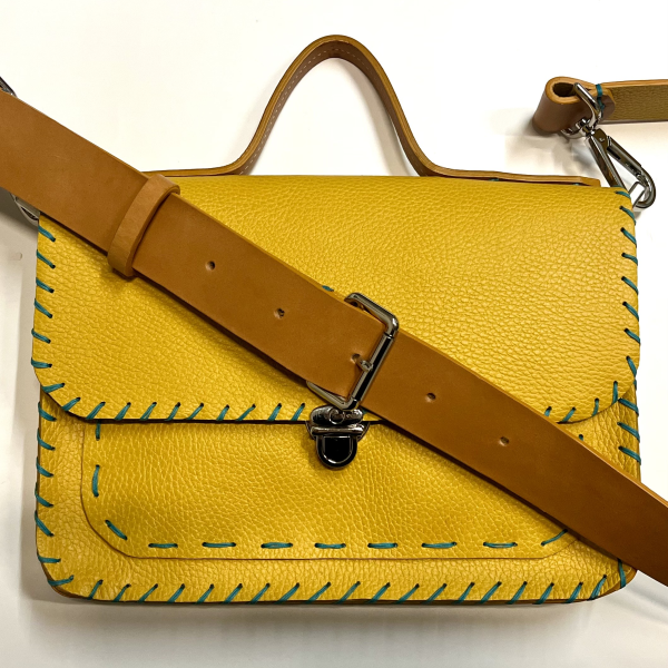 in pelle di vitello bottalata, la cartella Linda e’ compatta ma capiente. Ogni pezzo e’ tagliato, forato, tinto e cucito a mano. Un pezzo unico. La cartella e’ dotata di due tracolle, una in tessuto, l’altra in cuoio doppiato con la pelle della cartella.Il manico in cuoio ha le cuciture turchesi che delineano tutta la borsa. La fodera in pregiata pelle di nappa turchese. Dettagli misura larghezza cm 28,5, alta cm 19, profonda cm 5. La tasca a toppa sul davanti misura cm 24,5x16,5. La tracolla misura cm 107/127.
